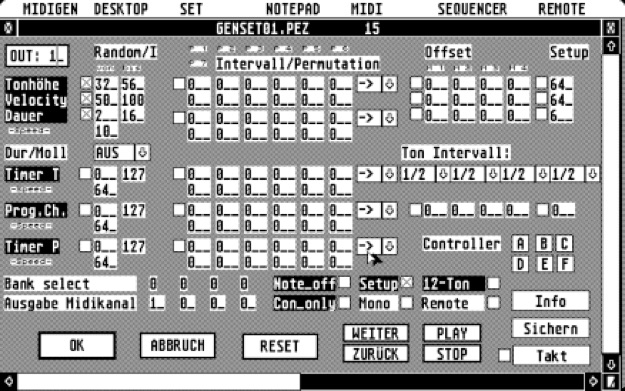 The program generates MIDI-data based on algorhythms or ranged random behavior. The 16 sets of up to 21 Generators can be controlled via keyboard-shortcuts external MIDI-CCs. The range of control, even on simple sound-modules is amazing and could not be achieved with any other software for Atari by the time.